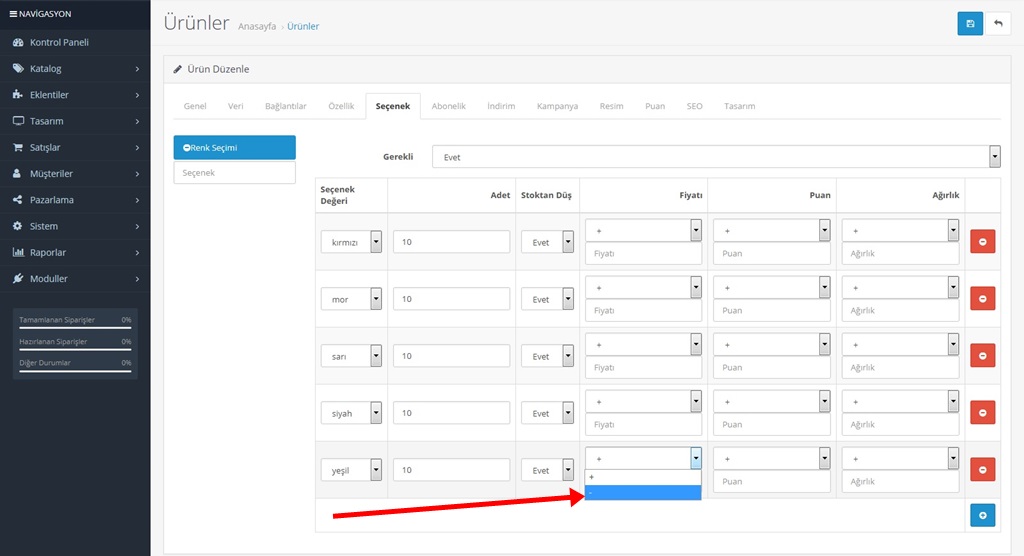 Aynı bölümde varsayılan artı işaretlidir 20 tl yazdığınızda ana fiyat üzerine 20 tl ekleyecektir farklı varyasyonlarınızda ek fiyat uygulaması olarak bu seçeneğide kullanabilirsiniz.