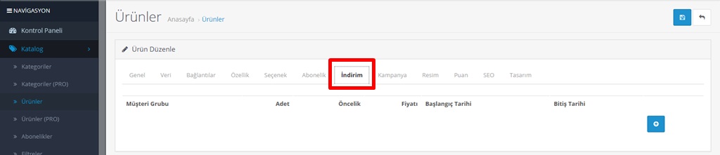 Ürün düzenleme sayfasındaki üst sekmelerden indirim sekmesine tıklayın.