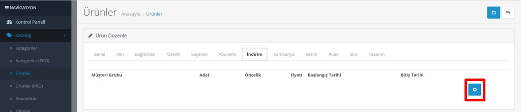 Yönetim paneline giriş yapın sol kısımdaki nagivasyon menüsünden katalog sekmesine tıklayın ardından ürünler seçeneğine tıklayın. Ürün listenizden toplu alıma indirm yapmak istediğiniz ürünün sağ tarafındaki mavi düzenleme butonuna tıklayın.