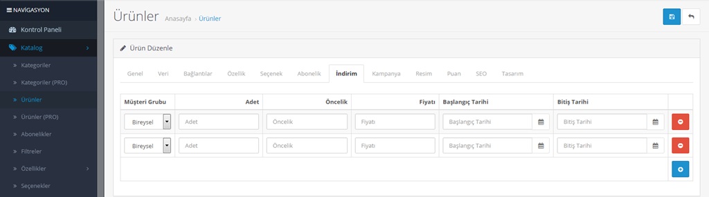 Bu bölümde örnek olarak 100 tl olan bir ürünü 3 adet alınması durumunda 250 tl ye alınabilinir yapacağız. Ürünün ilk fiyatı ürünü yüklerken fiyat bölümüne eklediğiniz fiyatı göründüğü için indirim seçeneklerine 2 adet alımdan başlatacağız.