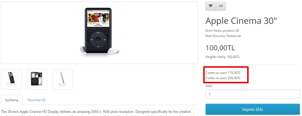 Şimdi artık bu ürün 2 adet alındığında sepete otomatik olarak 175 tl 3 adet alındığında ise otomatik 250 tl olarak işleyecektir. Bu uygulamayı sınırsız sayıda yapabilirsiniz 5 adet alna 10 adet alana şeklinde daha fazla indirim seçeneği sunabilir ürünü sitenize gelen ziyaretçilerinize daha cazip bir hale getirebilirsiniz. Bu işlem sonrası eticaret sitenizde ürün anasayfada, kategorilerde ve indirim ile alakalı modüllerde üstü çizili olarak görünecektir.