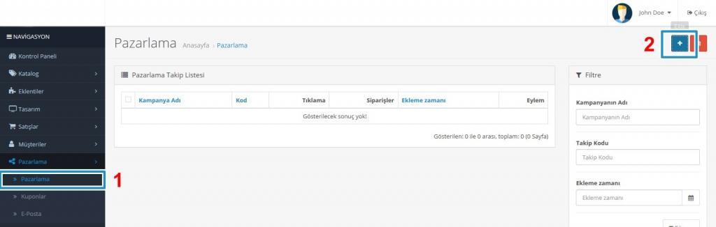 Yönetim panelinize girin. Sol menüden pazarlama sekmesine ardından altta açılan pazarlama sekmesine tıklayın. Sağ tarafta kampanya takip listesi bölümü çıkar. Sağ üstten + işaretine tıklayın.