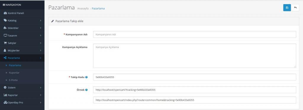 Kampanya adını yazın Kampanya içeriğini açıklayıcı yazın Takip Kodu: otomatik gelir Örnek bölümündeki ve altındaki url takip edeceğiniz kampanyalı ürünün url’sini nasıl hazırlamanız gerektiğine bir örnektir. Örneğin takip kodumuz bu: 5e90b433a9355 bu kodu /?tracking=5e90b433a9355 takip edeceğimiz ürün sayfası url’si sonuna ekleyeceğiz. Takip edeceğimiz kampanya ürünü sayfa url’si bu https://www.siteniz.com/ bu url sonuna https://www.siteniz.com/?tracking=5e90b433a9355 bu şekilde kampanya takip kodumu ekliyoruz. Url’imizi bu şekilde hazırladıktan sonrasağ üst kısımdan kampanyanızı kayıt edin. Hazırladığınız url’yi üst menü yada yan menü gibi manuel link eklenebilir yerlere bu şekilde https://www.siteniz.com/?tracking=5e90b433a9355 yapıştırıyoruz. Bu işlemi yaptıktan sonra kampanyalı ürünümüze kaç kişinin ilgi gösterdiğini gözlemleyebiliyoruz. Oluşturduğumuz takip kodunu farklı amaçlar içinde kullanabilirsiniz. Örneğin reklam verdiğiniz diğer sitelere reklam bannerlerine bu url'yi verip diğer sitelerdeki performansını da takip edebilirsiniz.