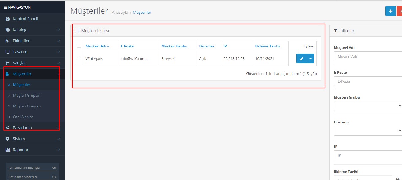 Müşteriler menüsünün altında yer alan Müşteriler ile sisteme kayıtlı olan tüm üyelerinizi görüntüleyebilirsiniz.